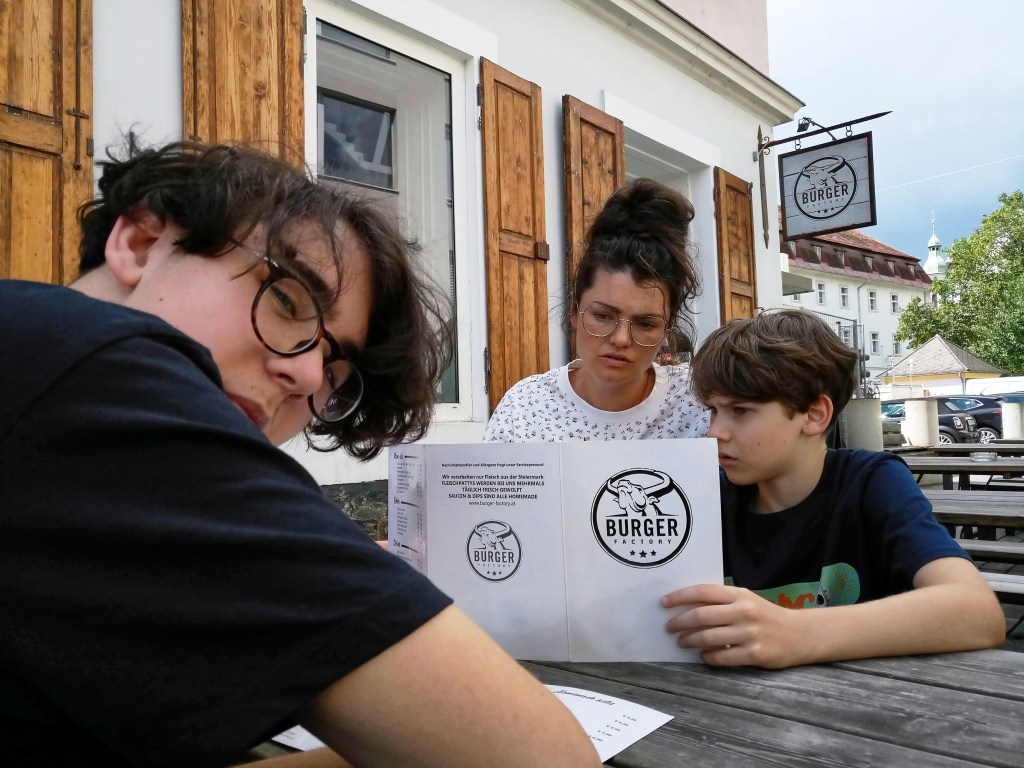 Nach den angeregten Gesprächen geht’s noch einmal zurück nach Graz. Noah hat einen sehr leckeren Burger Laden ausgesucht.